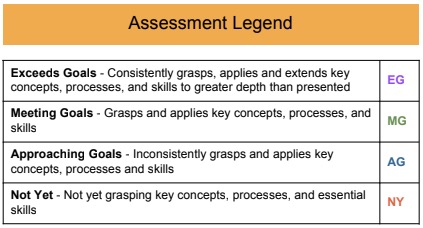 A Report of Progress has three major components. First is the progress and/or grade part of the report. This is an overall snapshot of the learner’s progress at concepts, skills, and standards. Each learner will receive a progress descriptor as shown in the legend below: